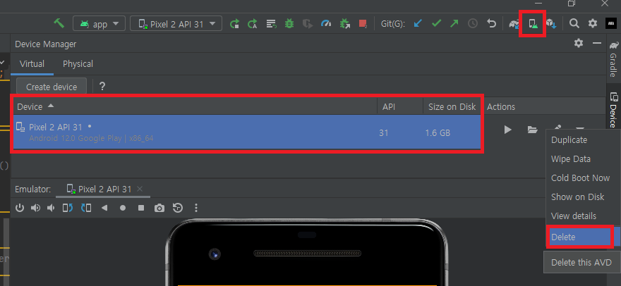 5. 안드로이드 스튜디오를 켜서 실행해보고 안되면 디바이스 매니저로 들어가서 AVD재설치 해주면 된다.