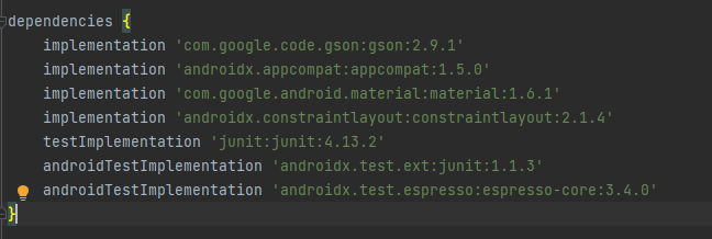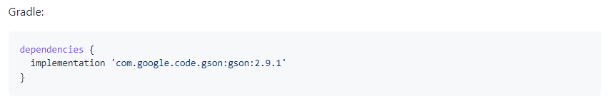 Gson 깃허브로 들어가서 최신 버전의 implementation을 복사해서 build.gradle의 dependencies에 붙여넣는다