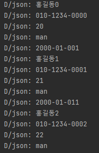 String json = "[{'DOB':'2000-01-01','age':23,'gender':'man','name':'홍길동','phoneNumber':'010-1234-5678'},{'DOB':'2000-01-01','age':23,'gender':'man','name':'홍길동','phoneNumber':'010-1234-5678'},{'DOB':'2000-01-01','age':23,'gender':'man','name':'홍길동','phoneNumber':'010-1234-5678'}]";