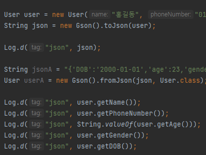 String json = "{'DOB':'2000-01-01','age':23,'gender':'man','name':'홍길동','phoneNumber':'010-1234-5678'}";