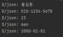 D/json: {"DOB":"2000-01-01","age":23,"gender":"man","name":"홍길동","phoneNumber":"010-1234-5678"}