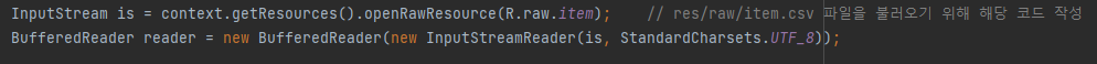 InputStream is = context.getResources().openRawResource(R.raw.item); // res/raw/item.csv 파일을 불러오기 위해 해당 코드 작성