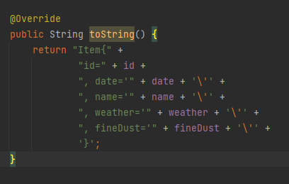 item.setFineDust(tokens[4]); // 미세먼지 상태 저장