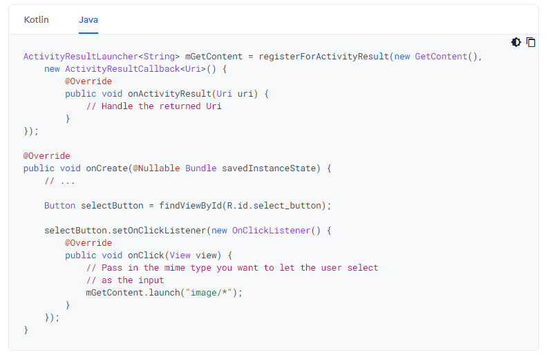 안드로이드 개발자 사이트에 ActivityResultLauncher를 이용해서 결과를 받아오는 예제가 있다. 우리는 이것을 따라해보려고 한다.