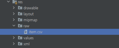 지금은 csv 파일을 파싱하여 리스트에 넣기만 할거라서 res 풀더에 raw 풀더를 만들어주고 해당 csv를 넣어보자.