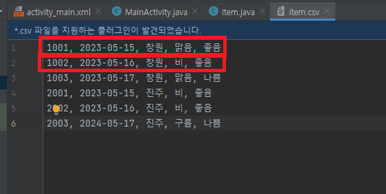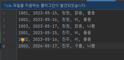 해당 csv 파일을 보자 1행에 1001, 2023-05-15, 창원, 맑음, 좋음 이 적혀있고