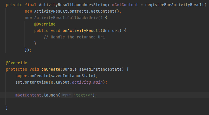 ActivityResultLauncher<String> mGetContent = registerForActivityResult(new GetContent(),