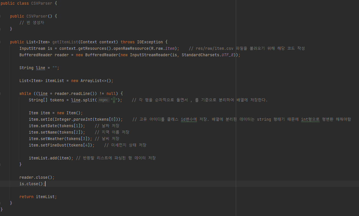 item.setWeather(tokens[3]); // 날씨 저장