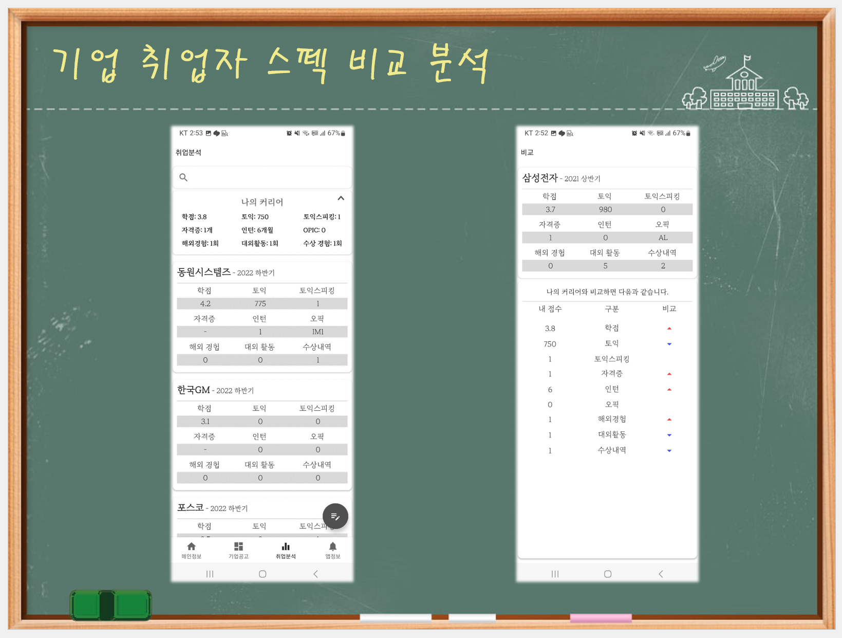 그리고 사용자 정보를 입력하면 이전에 어떤 기업에 합격한 스펙과 비교해 주는 시스템과