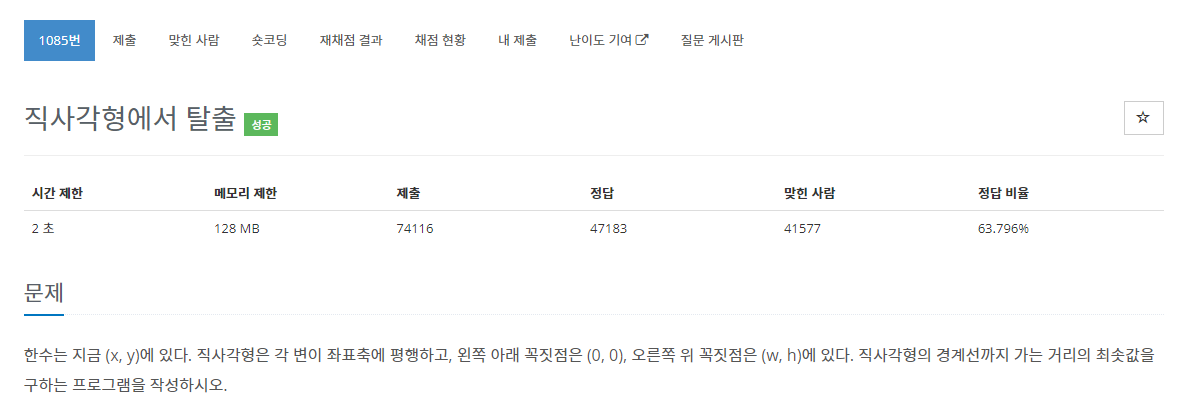 x, y로부터 0, 0 ~ w, h 까지의 직사각형에서 가장 짧은 거리가 답이다