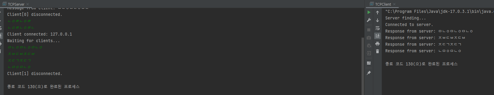 보통 자바 소켓 통신에서 한글이 깨져서 출력될 때는 코드에 인코딩이 제대로 안되어 있으면 한글이 깨질 가능성이 높다고 한다. 그래서 서버와 클라이언트 모두 UTF-8 인코딩 설정을 해줘야하지