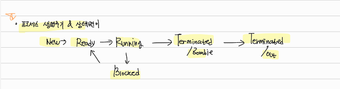 New -> Ready -> Running -> Terminated/Zombie -> Terminated/Out