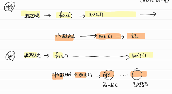 종료코드를 부모 프로세스에서 읽지 않아 리소스는 반한되었지만 PCB는 커널에 존재하여 시스템(프로세스 테이블)에 남아있는 완전히 종료되지 않은 상태