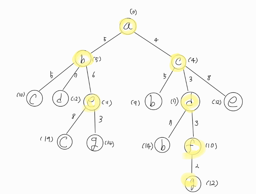 시작 노드 A 에서 목표 노드 G까지 탐색 방법은 최소 비용을 우선으로 고른다는것이다.