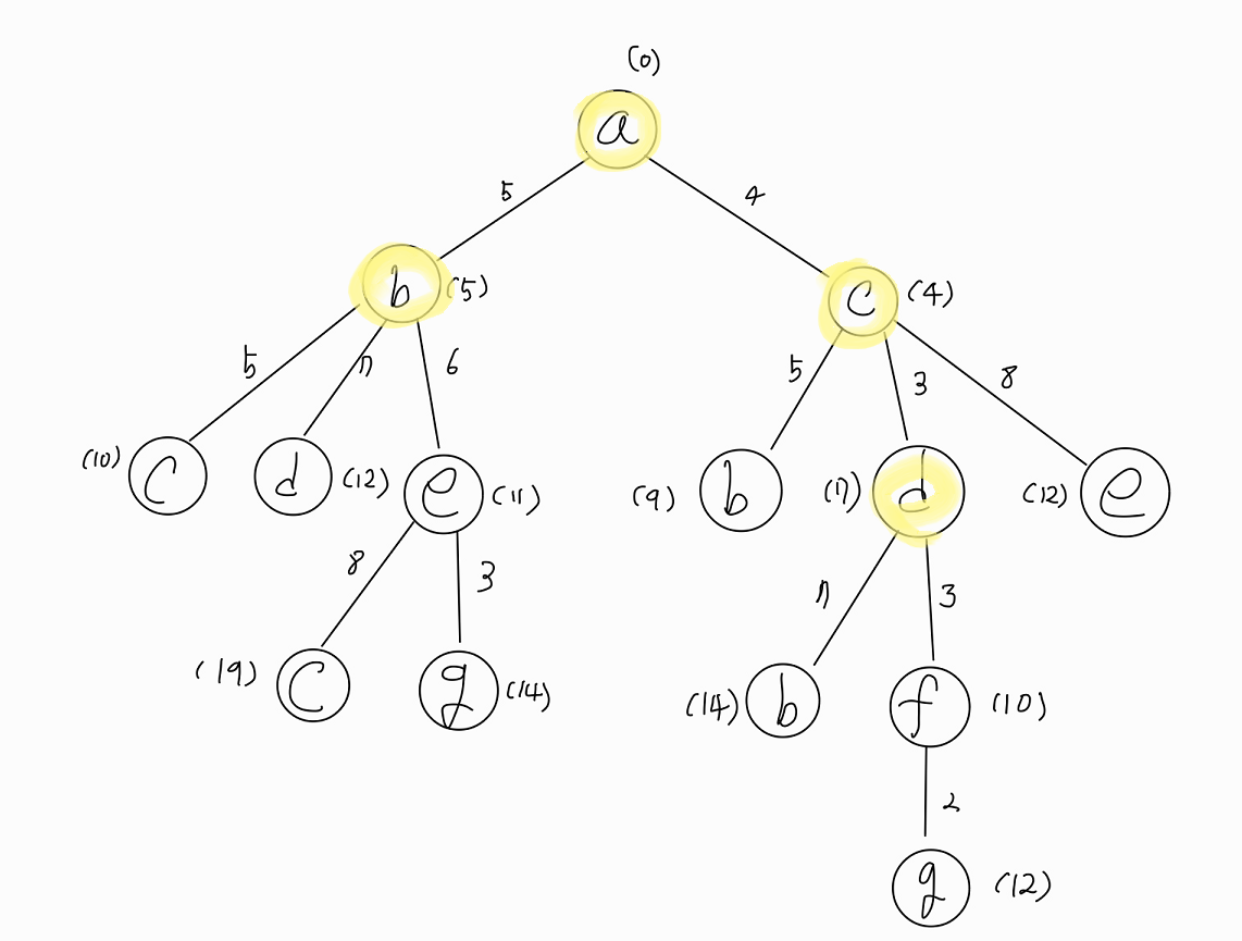 A -> B -> D 노드는 자식 노드를 그리지 않는다. 왜냐하면 같은 레벨의 다른 D 노드의 비용이 더 작기 때문에