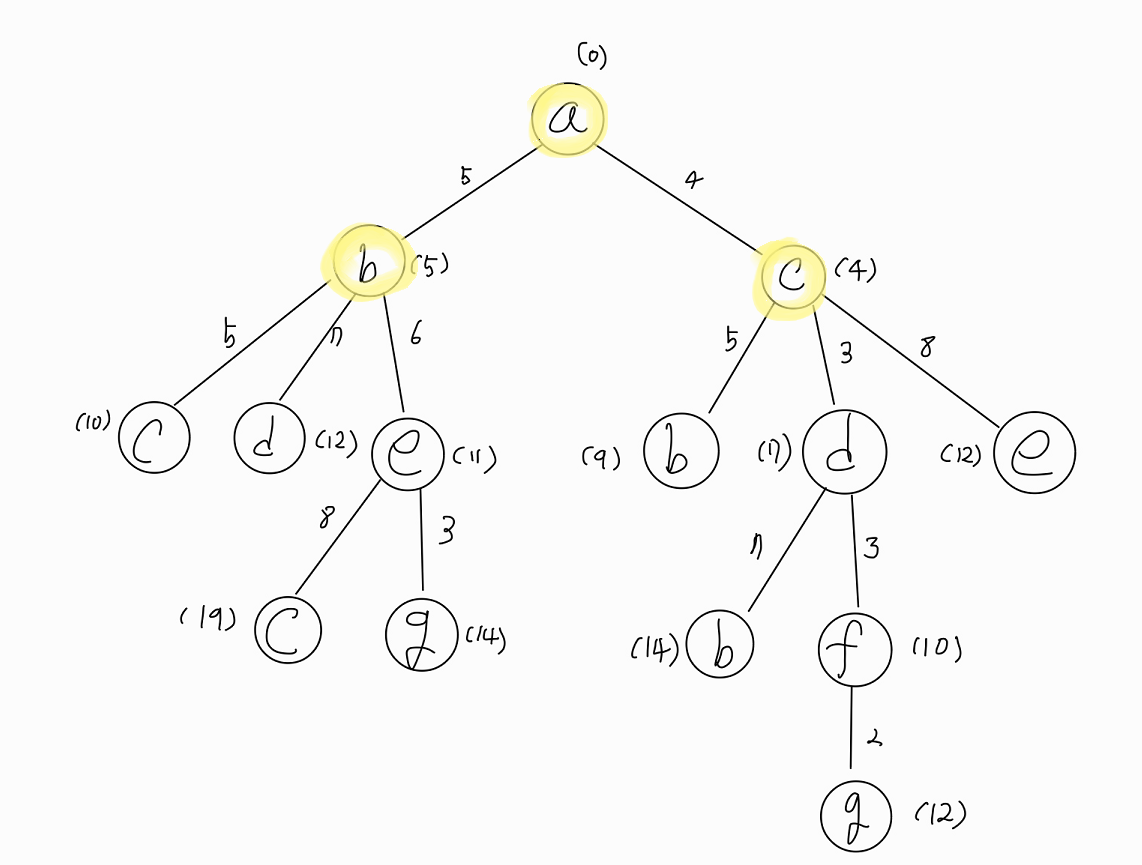 A -> B - > C 노드는 자식 노드를 그리지 않는다. 왜냐하면 위 레벨에 같은 이름의 C 노드의 비용이 더 작기 때문에