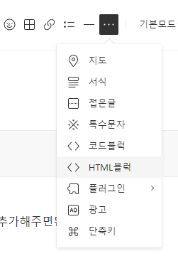 상단에 ... 버튼 눌러서 HTML 블럭 버튼 누르면