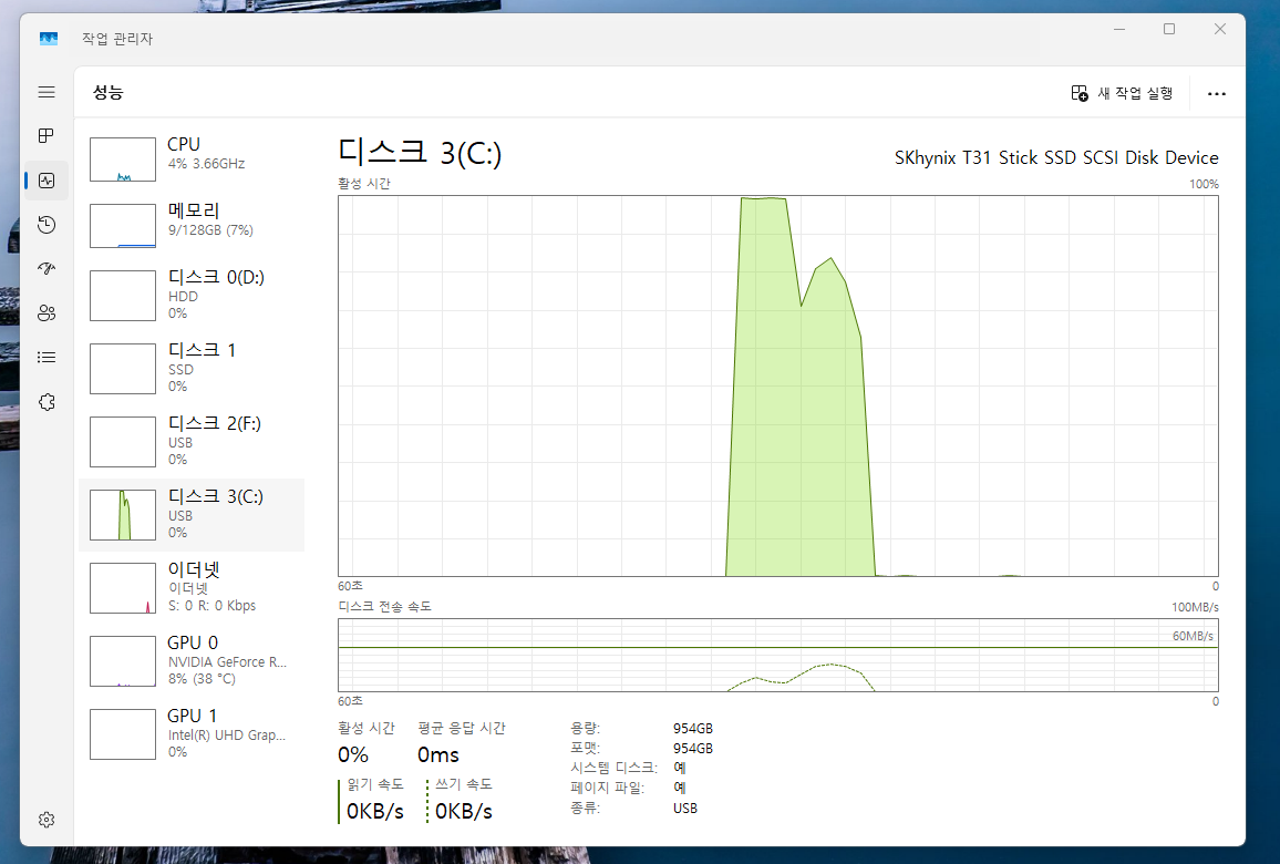 게임을 종료하기 직전과 그 후에 디스크 활성? 잘 모르겠지만 100%를 찍더군요. 작업관리자를 종료하고 다시 실행하였을 때 0%를 유지했습니다.