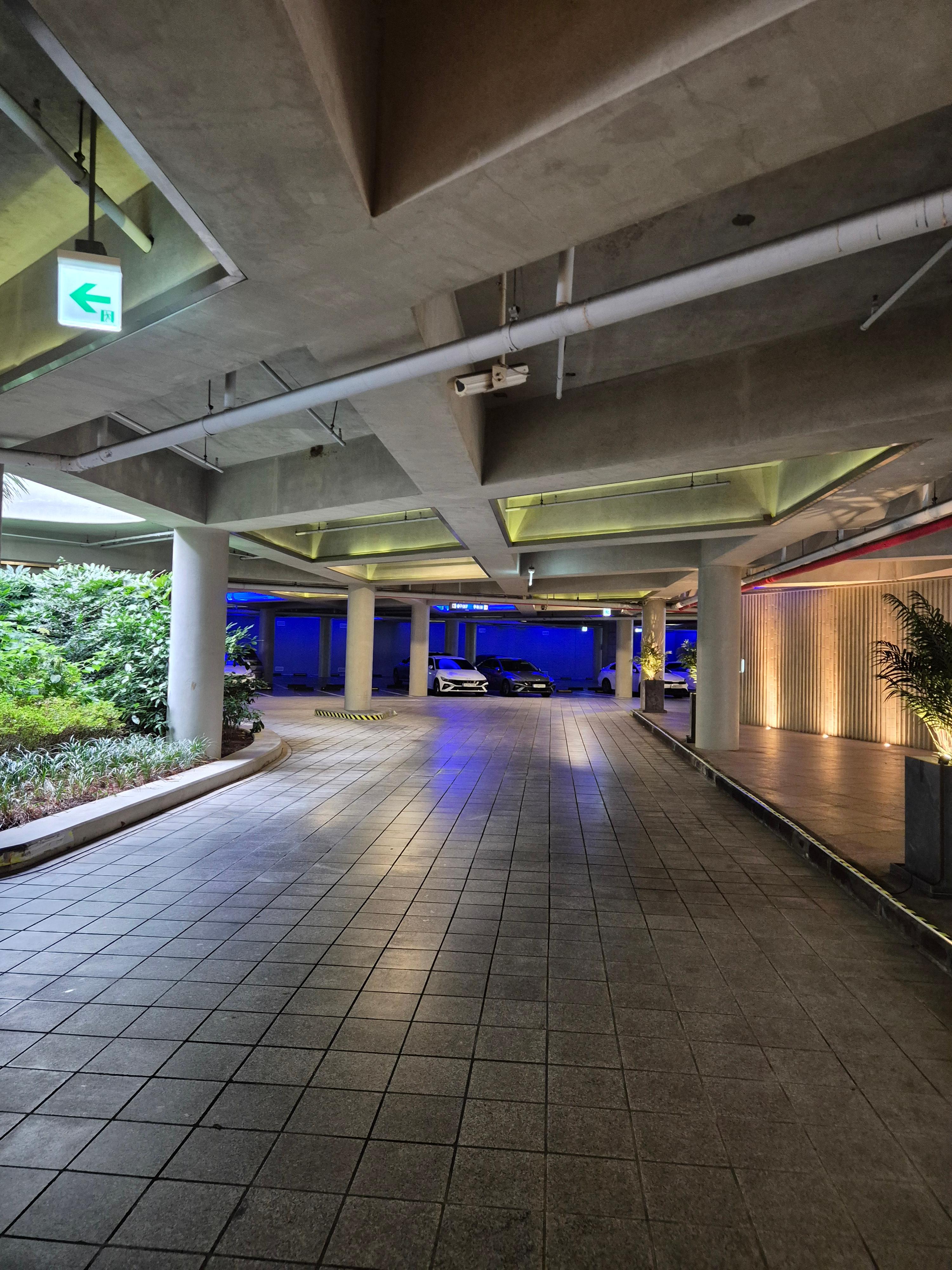 주차장 안쪽은 파란색 조명이 꽤 어두워서 주차할 때 불편한 부분이 있습니다.