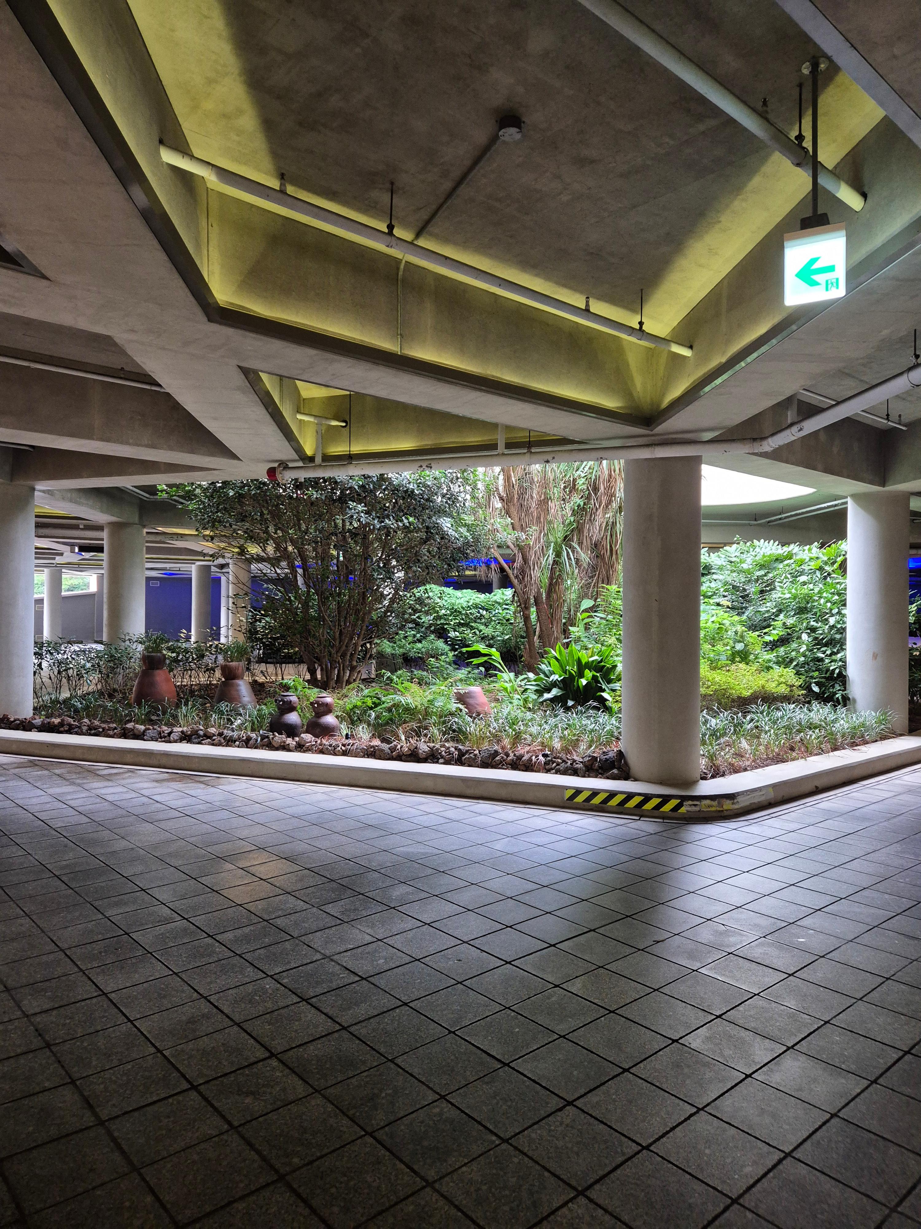중앙에 작은 식물 정원이 있는데, 햇빛 조명과 내부 LED 조명이 어우러져 주차장이 꽤 몽환적인 느낌이 있습니다.