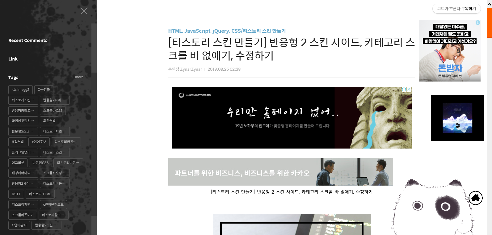 | [티스토리 스킨 만들기] 블로그 화면에 이미지 고정시키기, 구석에 고양이 만들기 (2) | 2019.08.25 |