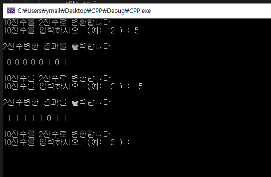 printf("10진수를 2진수로 변환합니다.\n10진수를 입력하시오. (예: 12 ) : ");