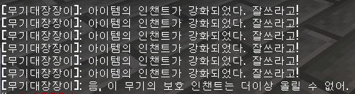 message "[무기대장장이]: 아이템의 인챈트가 강화되었다. 잘쓰라고!" to player