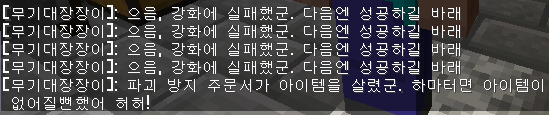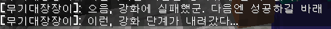 message "[무기대장장이]: 으음, 강화에 실패했군. 다음엔 성공하길 바래" to player