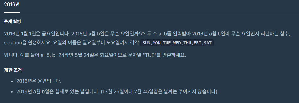 시간을 계산해주는 방법을 찾아서 2016년 1월 1일 부터 해당 날짜까지 시간을 계산해서 요일을 구한다.